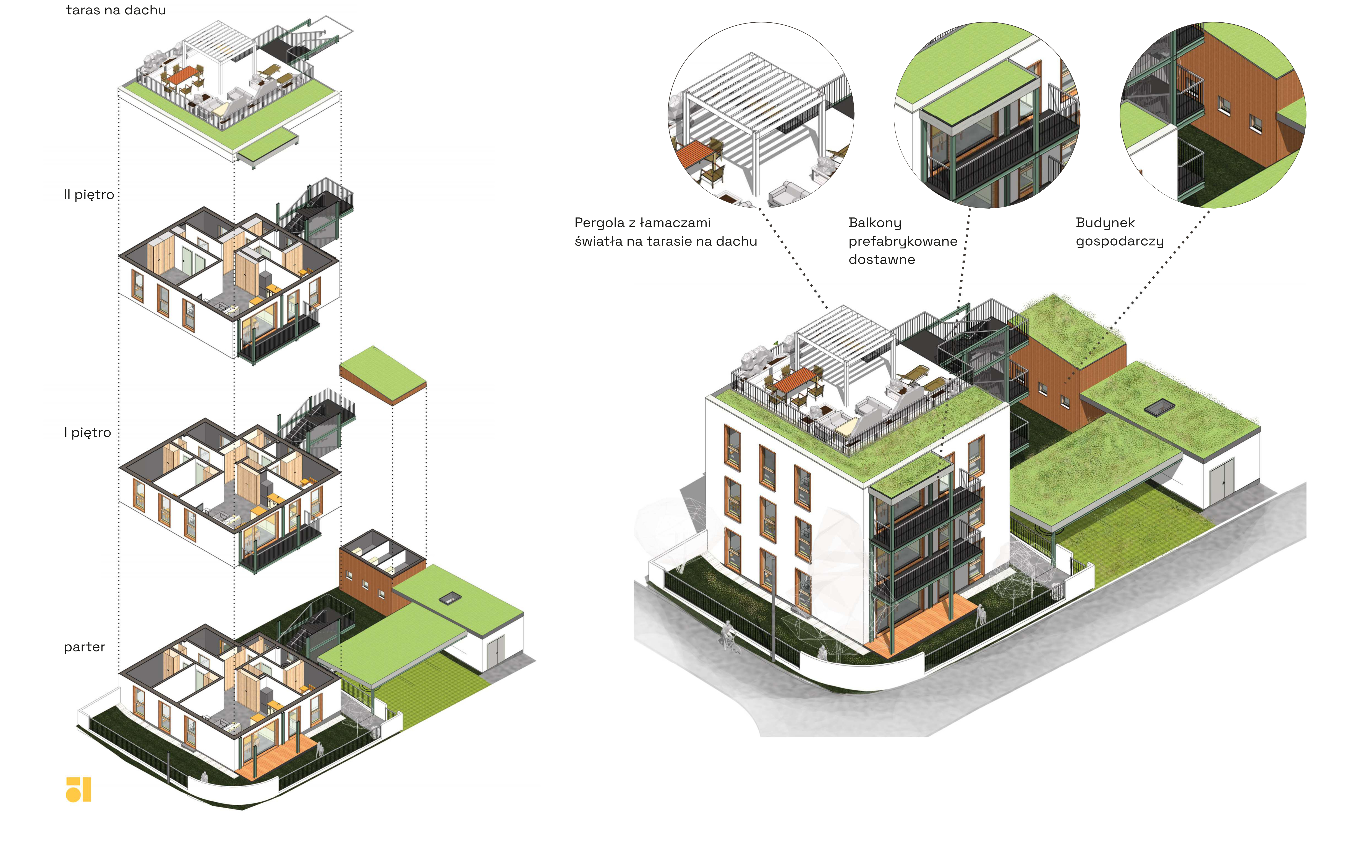 Budynek wielorodzinny w Gdyni Orłowie realizowany w ramach kooperatywy mieszkaniowej. Oddolna inicjatywa budowlana trzech rodzin ma na celu zaspokojenie własnych potrzeb mieszkaniowych. Projekt dał szanse na podejście holistyczne do procesu i obejmuje całość koordynacji, tworzenia dokumentacji, organizacji procesu budowy i nadzorów.