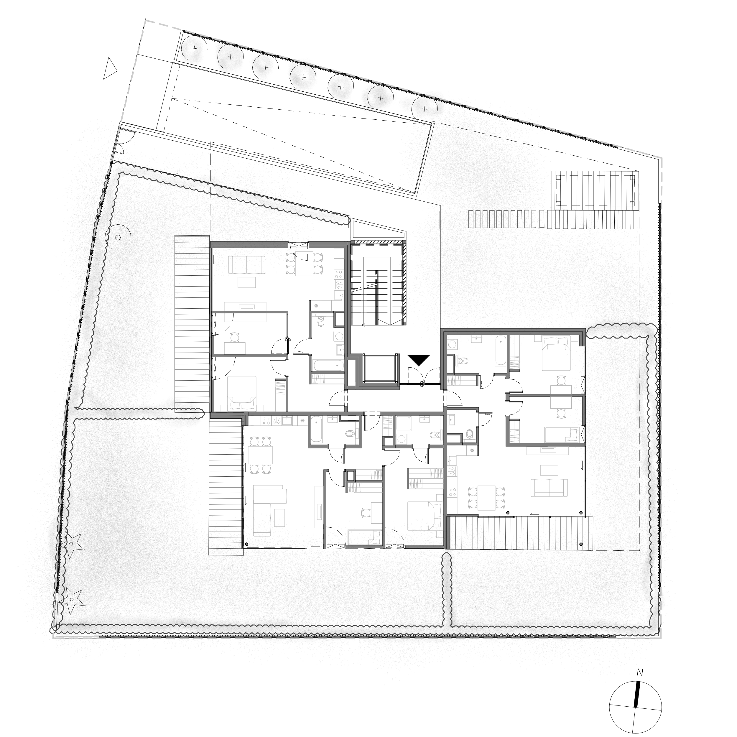 Wejście do budynku zostało podkreślone przez podcięcie bryły w północnej elewacji. Podcień prowadzi do wiatrołapu, windy i zewnętrznej klatki schodowej. Każdy z sześ-ciu lokali posiada częściowo zadaszony taras. Najbardziej atrakcyjne mieszkanie znajduje się na najwyższej kondygnacji, ze względu na największy taras, najlepsze nasłonecznienie oraz częściowy widok na morze i klif orłowski.